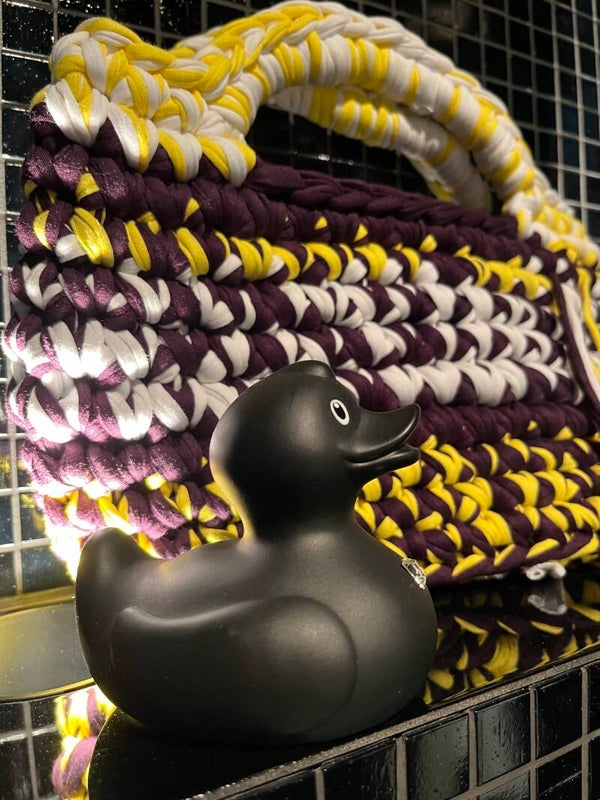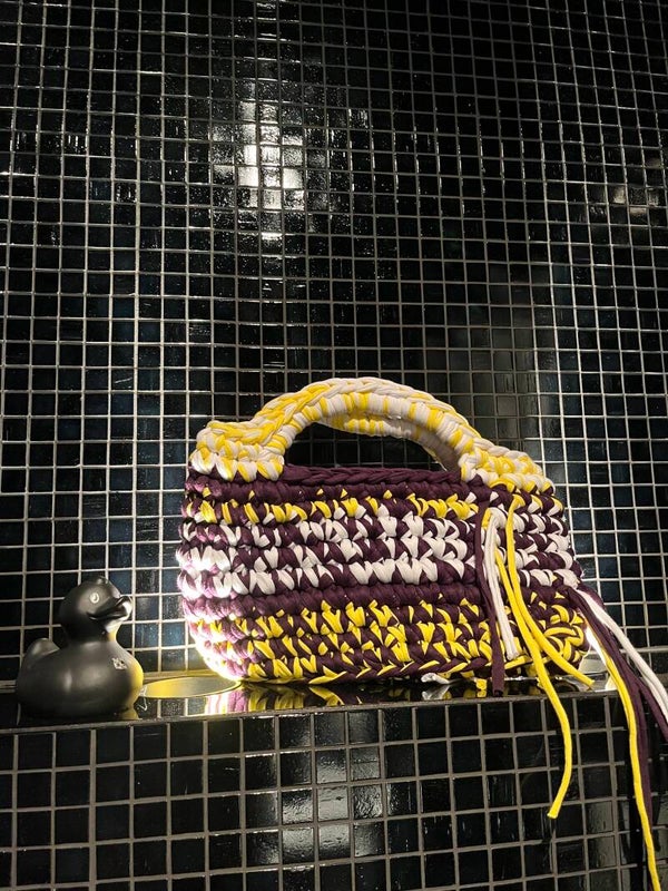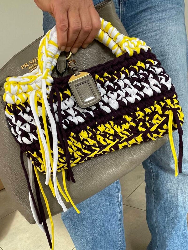Tasche aus recycelten T-Shirt Garn mit langen Bändern